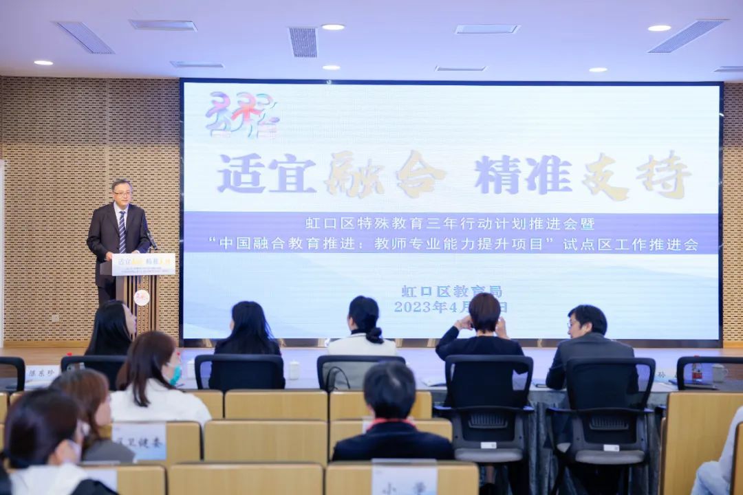 4月26日,“适宜融合 精准支持”虹口区特殊教育三年行动计划推进会暨“中国融合教育推进:教师专业能力提升项目”试点区工作推进会在广灵路小学召开。
