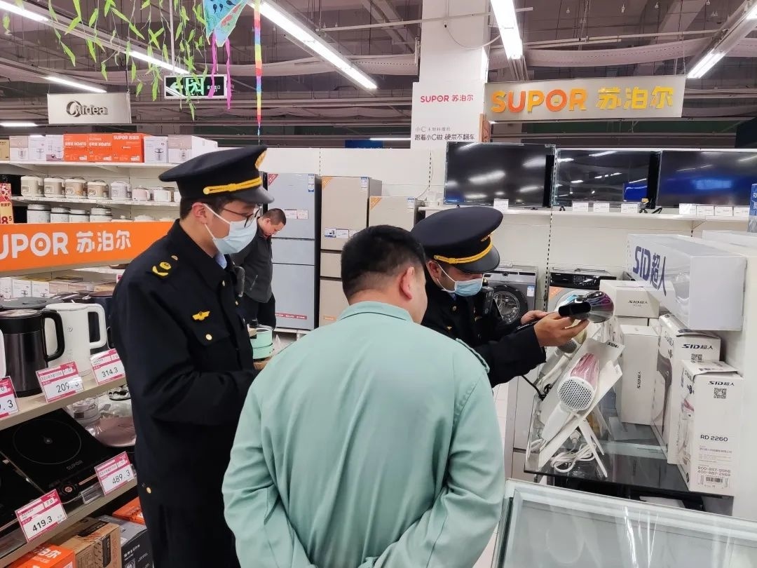 在沈浦泾路上的华润万家超市,执法人员主要检查了现阶段相对畅销的电扇、拖线板、吹风机等产品的包装标识信息,并用“条码追溯”小程序检查了上述商品条码信息,被检产品均在显著位置标注有3C标志,所标注的执行标准均符合要求。