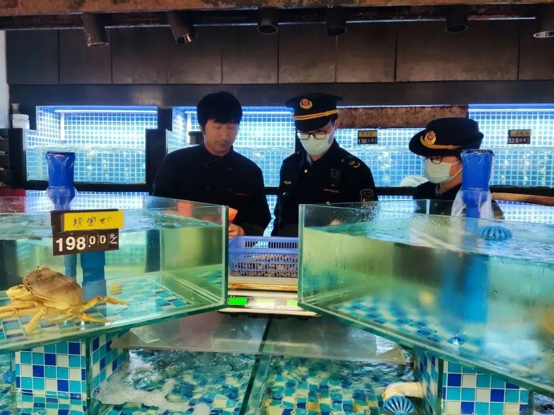 执法人员来到位于金龙新街的全盛大酒店,重点检查贸易结算类电子秤是否按期进行强制检定、铅封是否完整、是否存在作弊功能、是否存在称重不去皮等情况。检查中,执法人员发现水产品称重计量时,并未去皮称重,责令商家立即整改。