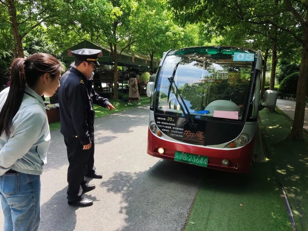 执法人员来到花开海上景区,对观光车辆的喇叭、灯光、安全带有效性、人员持证情况和设备资料等进行了检查,均未发现问题。执法人员提醒花开海上负责人,在五一期间游客满载的情况下,观光车辆尽量慢速匀速行驶,保持特种设备安全平稳运行。
