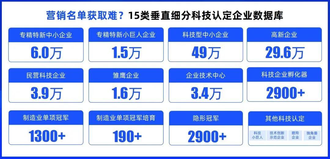 “启信慧眼”依托启信宝汇聚的境内2.3亿家企业等组织机构的超1000亿条实时动态商业大数据,将国家、省、市、县区等多级科技认定名单整合为“知识数据”,形成超20类科技认定企业库,包括专精特新、制造业单项冠军、服务型制造业示范企业、雏鹰企业等。