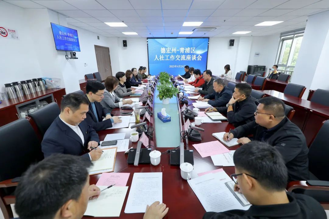4月24日,云南省德宏州劳务协作工作组来青浦区,与青浦区人社部门就深化两地劳务协作、技能援教、推动人力资源产业发展等工作开展交流座谈。青浦区人社局局长俞藕英、副局长吴薇、副局长罗金慧,德宏州人社局局长李漾湖、副局长杨臣,以及两地人社部门相关人员出席。