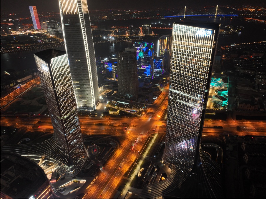 徐汇滨江:以塔吊、西岸传媒港“九宫格”为主,节前开启了亮灯模式,楼宇形成点面结合、动静相宜、多层组织、立体生动的氛围,展现出了建筑的流线感,同时营造了高品质的城市灯景。