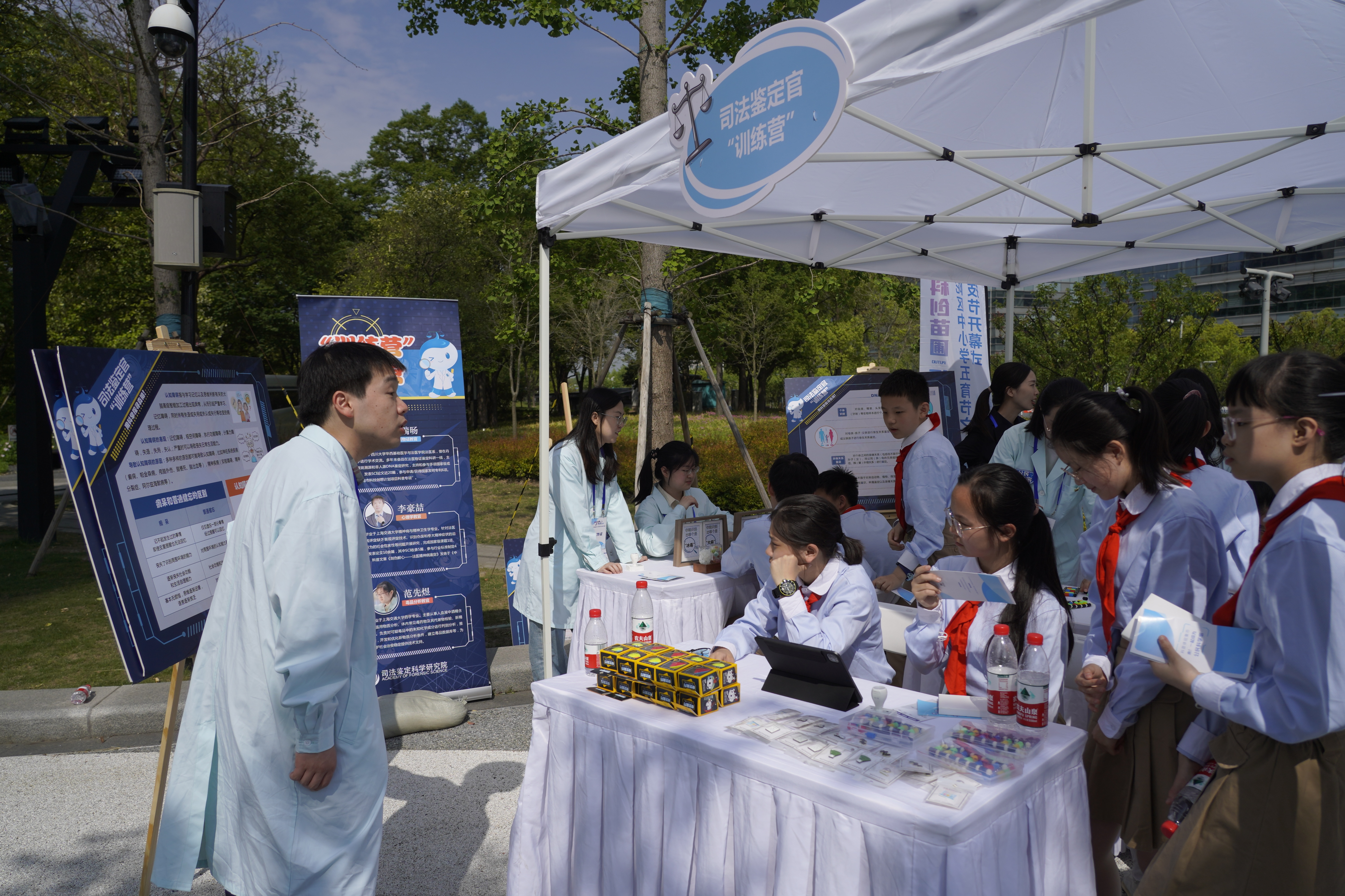 徐玉浩提到的“司法鉴定官‘训练营’”,是司法鉴定科学研究院的“公民科学家”们来为学生们带来的一系列的科普课程。“我们是用科学的手段为法庭提供科学的证据。今天带来的三个课程分别是毒品的识别、人类DNA双螺旋结构以及有关心理学的认知能力水平测试。”“公民科学家”王洁介绍道,“通过这种知识的传授和动手的实验,目的是让学生们对科学有一个懵懂的兴趣,让他们发掘科学的趣味,为他们埋下一颗科学的种子。”