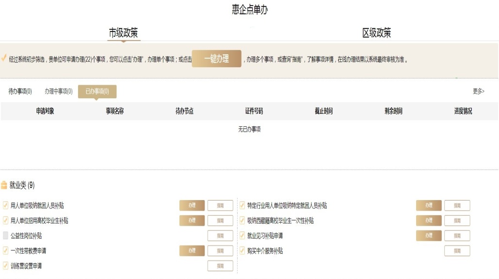 “惠企点单办”就是企业只需登录一个平台,就能打包办理就业、创业、培训等所有事项;只需打开一个界面,通过后台智能匹配,就能知晓本企业可享受的市、区两级政策;只需点击一个按钮,就能轻松提交多个惠企事项的申请。目前,点单办平台共包含市、区两级就业惠企政策109项。2022年累计办理事项24万余次,政策累计点击量110万次。