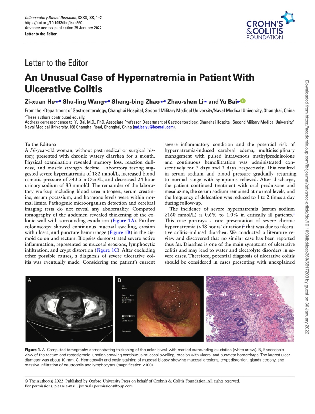近日,长海医院消化内科柏愚副主任团队针对一例“溃疡性结肠炎合并重度慢性高钠血症”患者救治过程,梳理总结经验,将相关成果刊发在炎症性肠病领域国际著名期刊《Inflamm Bowel Dis》上。