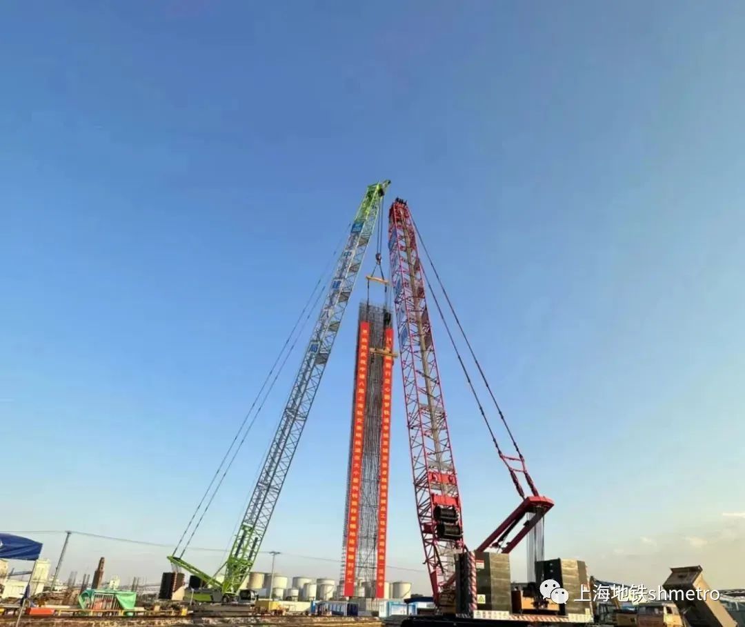 为顺利完成本次施工任务,项目调动300吨/200吨履带吊、成槽机等大型机械设备,将长51米,宽6.6米,总重69.94吨的钢筋笼成功下放,6小时完成254立方米混凝土浇筑。