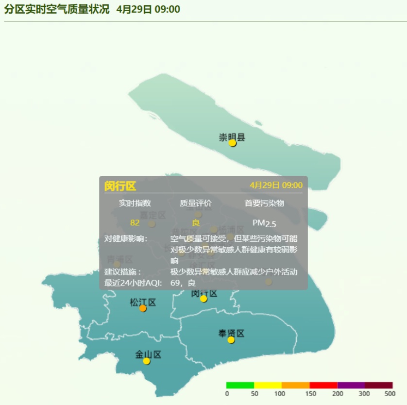 4月29日9时,闵行区AQI为82,良,首要污染物PM2.5。昨天AQI为69,良。据上海市环境监测中心预报,今天下午良-轻度污染,夜间轻度污染,明天良-轻度污染,后天良-轻度污染。