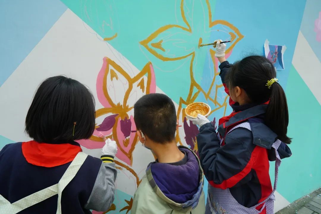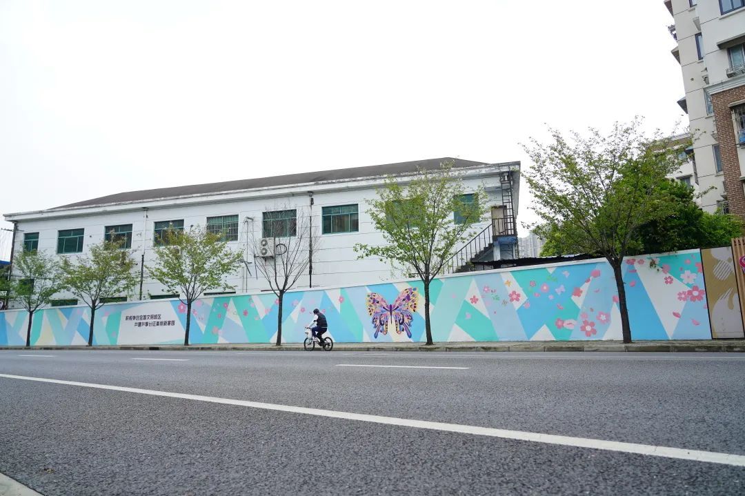 瞧!花家浜路樱花树掩映下的墙面,俨然就是一张巨型的天然画布,孩子们一手握笔,一手端着盛着颜料的碗,在老师们的指导下,找准点位,开始一笔一划、一丝不苟地在墙体上设计美、构建美、展现美。经过一番才艺展示,一只只色彩斑斓的蝴蝶就“飞”上了围墙,一朵朵鲜艳欲滴的春花就“开”在了围墙上。140多米的围墙上,蝴蝶、春花交相辉映,近看栩栩如生,远观蔚为壮观,吸引路人不断前来驻足观赏、拍照打卡。