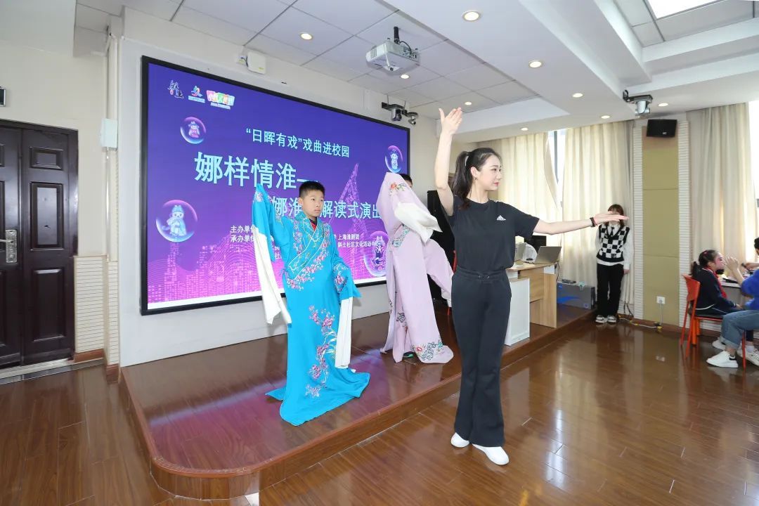 “大家知道淮剧是哪里的戏曲吗?”上海淮剧团的国家一级演员邢娜担任了活动主持人,以提问互动方式向大家介绍了地方剧种淮剧的特色。随后,青年演员一曲精彩的水袖舞完美地融合了舞蹈身段与水袖技巧,让同学们感受到了水袖“行云流水”般的美感。