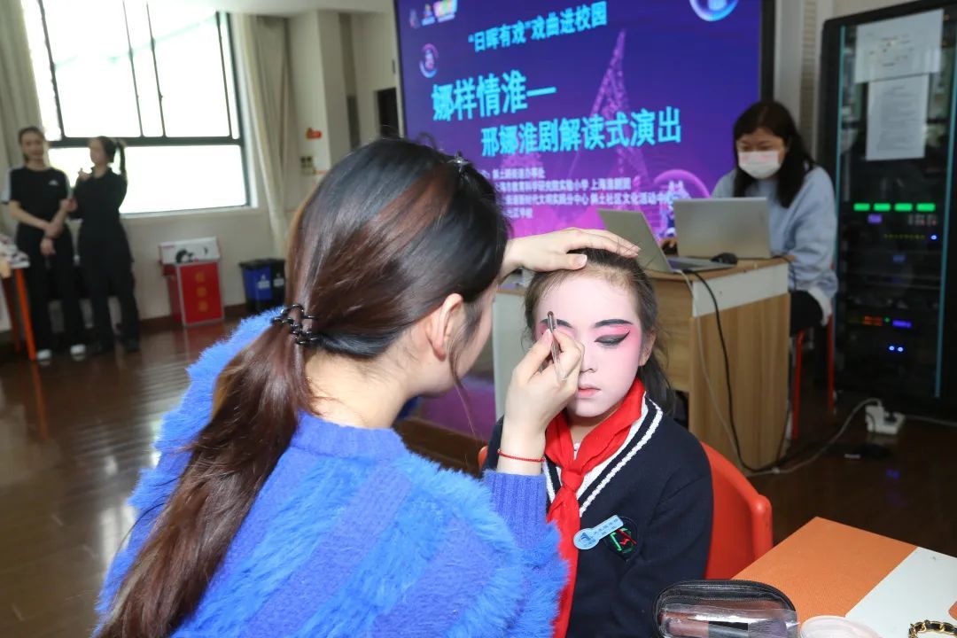 除了现场教学,还有学生体验了戏曲化妆。在老师的巧手下化上美美的戏妆,体验了一把戏曲情“淮”瘾。戏曲原本是舞台上的艺术,走下舞台、走进校园的近距离接触给孩子们带来了十分新奇的体验,也在他们心中种下了传统文化的种子。