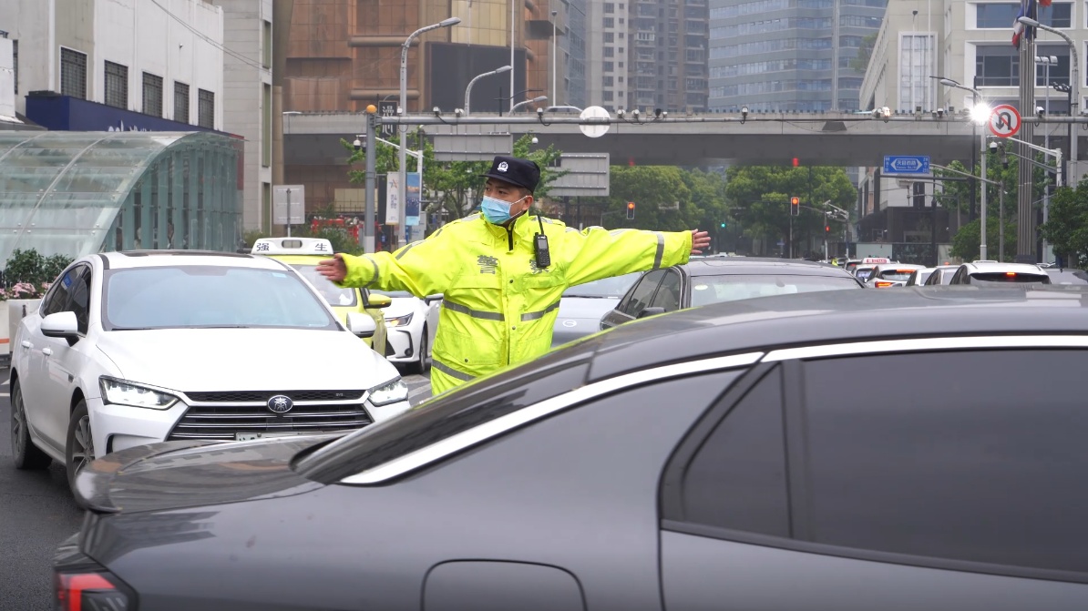 为维持交通秩序,静安公安加派警力,加强对天目西路、秣陵路沿线各个易拥堵路段的车流引导,确保旅客有序进站。