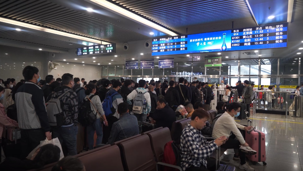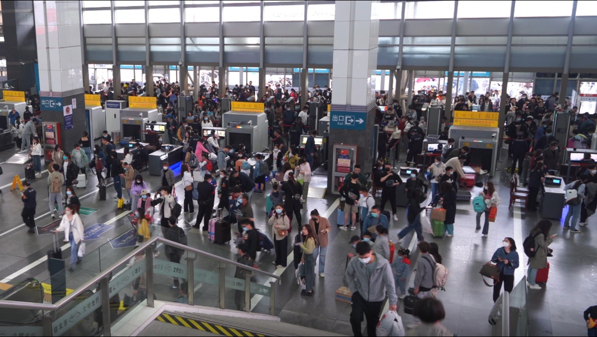 广场上,密集的旅客从轨交出口涌向火车站进站口,川流不息。车站内,不论是安检口、通道内、候车室,随处都是“人从众”的大客流景象。