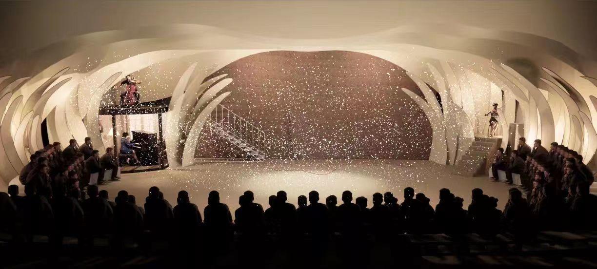 此次演出的舞台也同样让人期待。《百鸟朝凤》进行了大胆创新:以“羽”为概念,打造出一个轻盈的“巢”状包裹式演绎空间。写意的山峦湖泊在层叠的布景结构下充满了新艺术风格的自然意象,整体显现出的效果非常治愈。