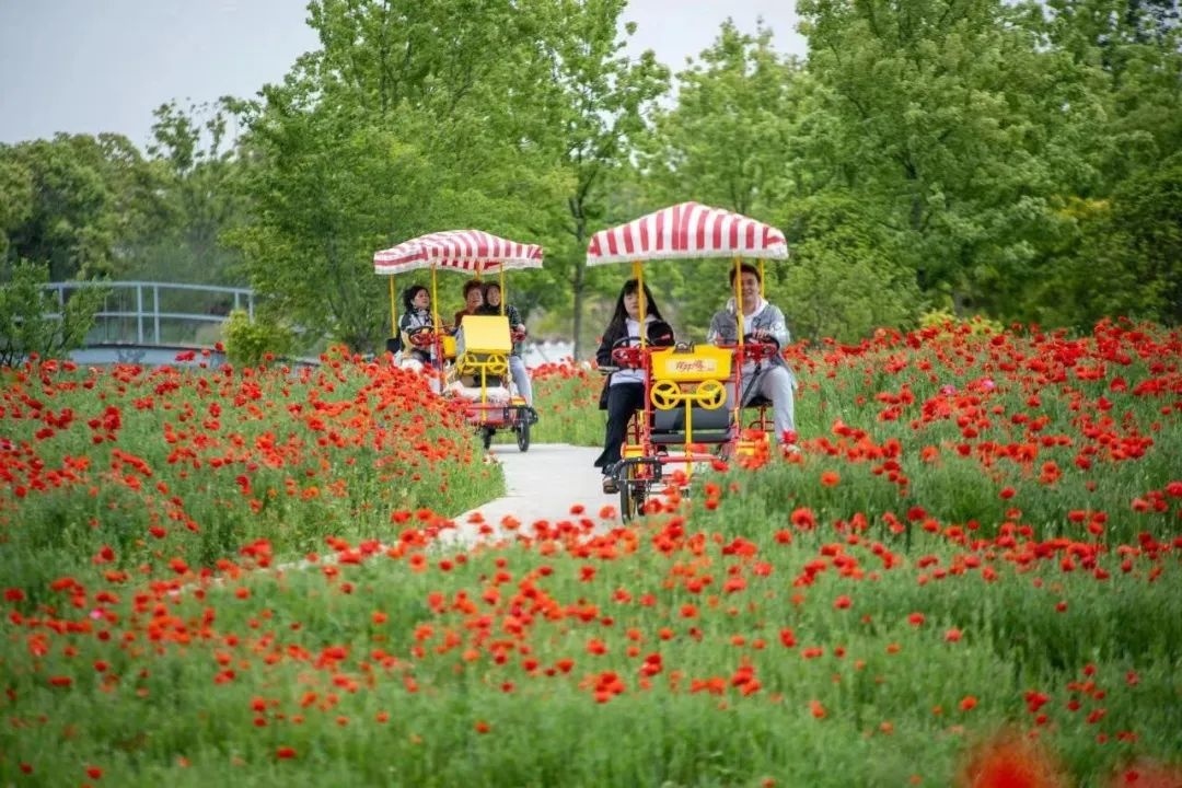 在朱泾镇待泾村的花开海上生态园,数百万余株虞美人已经进入最佳赏花期,200亩花田逐渐盛开,以“花之舞”命名的红色花海似为迎接立夏而跳起了火热的“桑巴”。花田中,趣味集市吸引了许多游客停留驻足,“每年基本我都会带一家老小来这里一次,今年感觉配套多了,活动多了,所以我们把一日游改为了两日游。”提前查询园区攻略前来的市民张女士一家,除了预订了民宿,还预约了芳香手工体验课程,她说,住在这里,老人、小孩、自己都很尽兴。