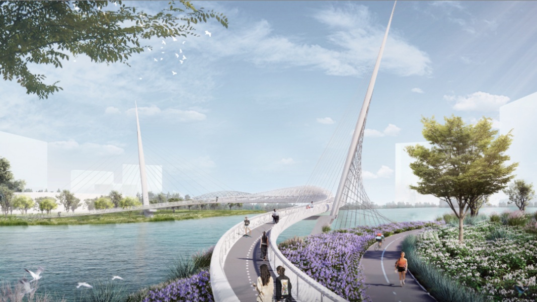 洋泾港与张家浜交汇处,拥有优越的景观条件。以“C”字型跨越两条河道交汇处的水舞桥,以“碧水微澜、舞光弄影”为设计理念,整个造型犹如舞动的飘带悬浮于水面之上,简洁而灵动。
