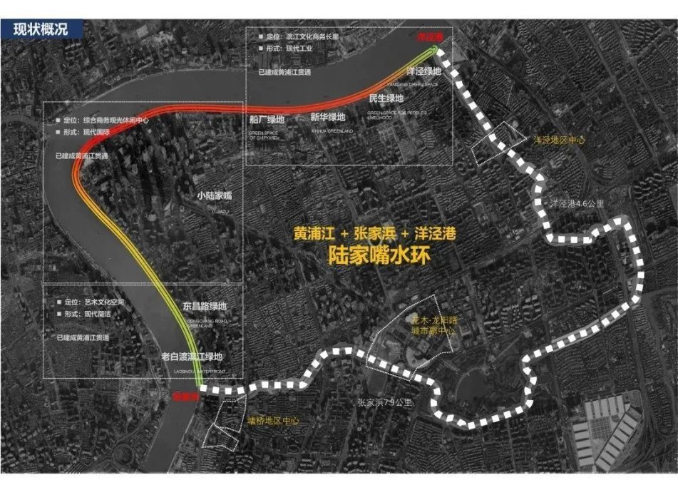 相比殷老伯所描绘的,陆家嘴水环有着更为丰富的概念、作用和意义。它是陆家嘴—世博单元空间规划结构“一轴一带二廊双环”中的一环,由单元内主要河道——黄浦江、张家浜、洋泾港组成。