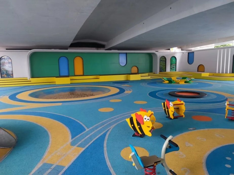 昌邑路桥下空间则延续了黄浦江滨江文化范围,与民生码头的艺术气息相融合,同样植入儿童游乐的功能,打造了复合型的艺术体验空间。在这里,混凝土地面有了蓝黄相间的底色,配上一个个卡通形状的儿童摇摇椅,以及玩沙坑、小蹦床,成为了周边居民带孩子活动嬉戏的好去处。