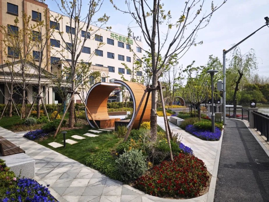 而在张家浜开元曼居酒店附近的一片绿地,则改造成了拼图花园,契合商务人群及周边居民区居民的需求,营造了一个安静舒适的人文阅读空间,成为商业用地作为公共绿地开放的示范点。