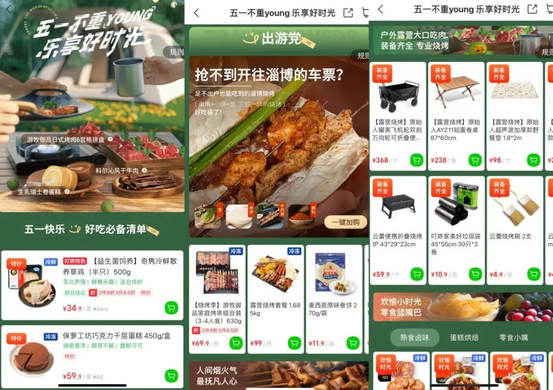 而对于想要宅家的人群,可以选择火锅预制菜、优质肉禽净菜和鲜活水产,比如蔡长青宫保鸡丁、免浆黑鱼片等,便捷地在家做健康大餐,享受假期清闲的时光。此外,平台还推出具有地域特色的一些美食,让宅家人群不出门就可以品尝各地特色。比如近期大火的淄博烧烤套餐,包含肉串、卷饼、小葱、蘸料,消费者不出行也能尝试淄博“烤法”。