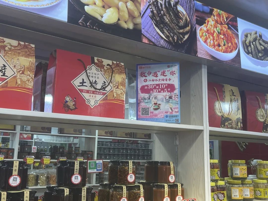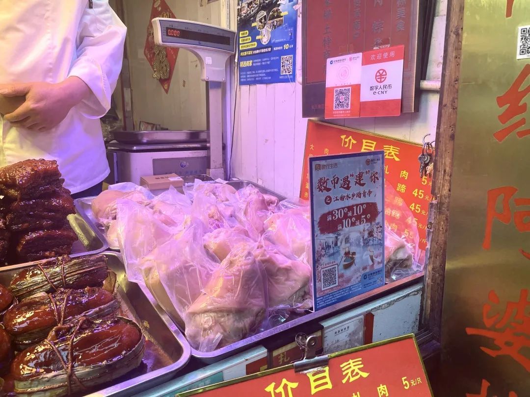“用数字人民币支付吧,满30减10元,老划算啦!”在王家栅阿婆粽店铺前,有不少市民正在挑选购买粽子和蹄髈,当顾客拿起手机要付款时,老板都贴心地指指中国建设银行“数字人民币”的付款二维码,推荐顾客“数币”支付。