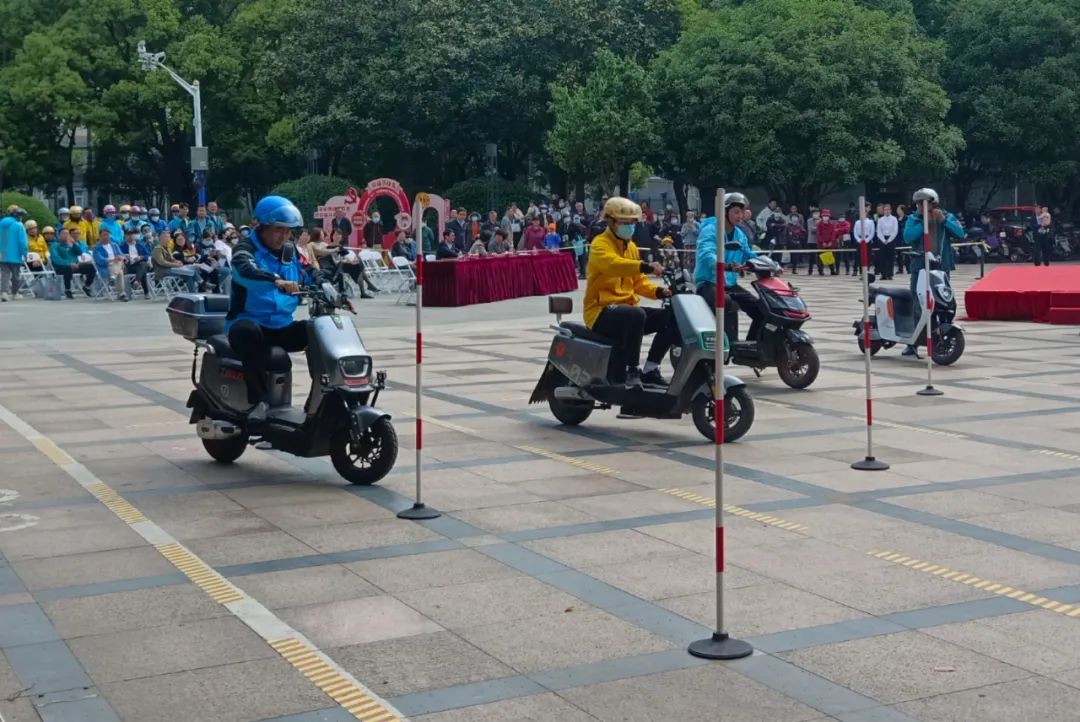 4月26日下午,一场激烈的竞速绕桩劳动技能竞赛在岳阳街道社区党群服务中心举行。来自中国邮政、美团、饿了么、盒马鲜生等单位的快递外卖“小哥”们,骑上电动自行车熟练地绕桩、投递,在竞技比拼中挥洒劳动激情。
