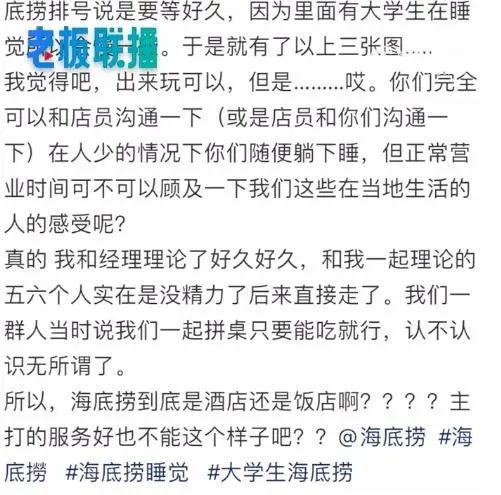 对此,海底捞南京该门店回应,当时确实因为太多人留宿导致翻台太慢。