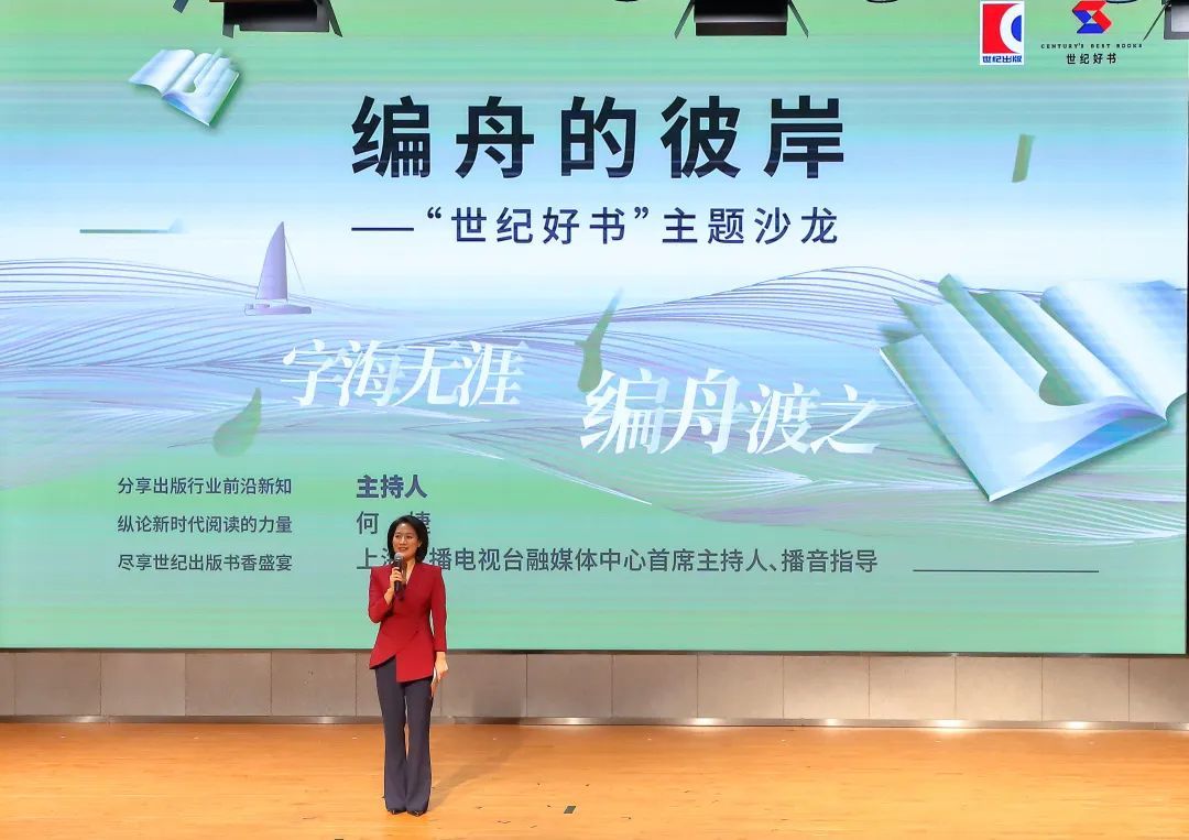 字海无涯,编舟渡之。做书的过程就是用热情和技艺,用几年甚至几十年的时间在浩瀚的字词海洋里编制一艘小船,彼岸是梦想,也是读者的喜爱。此次“世纪好书”沙龙即以“编舟的彼岸”为题,特邀上海广播电视台融媒体中心首席主持人、播音指导何婕担纲主持,与多位世纪出版人一起,围绕出版理念的提炼实现、重点产品的策划打造、图书品牌的建构推广等话题,分享“编辑部的故事”和出版前沿新知,为让更多人了解出版工作和阅读之美,沙龙不仅邀请了60多位参加世纪出版园“读者开放日”的热心读者观摩并参与编读互动,还全程在央视频、上海教育出版社视频号、上海译文出版社视频号等多家新媒体平台直播。