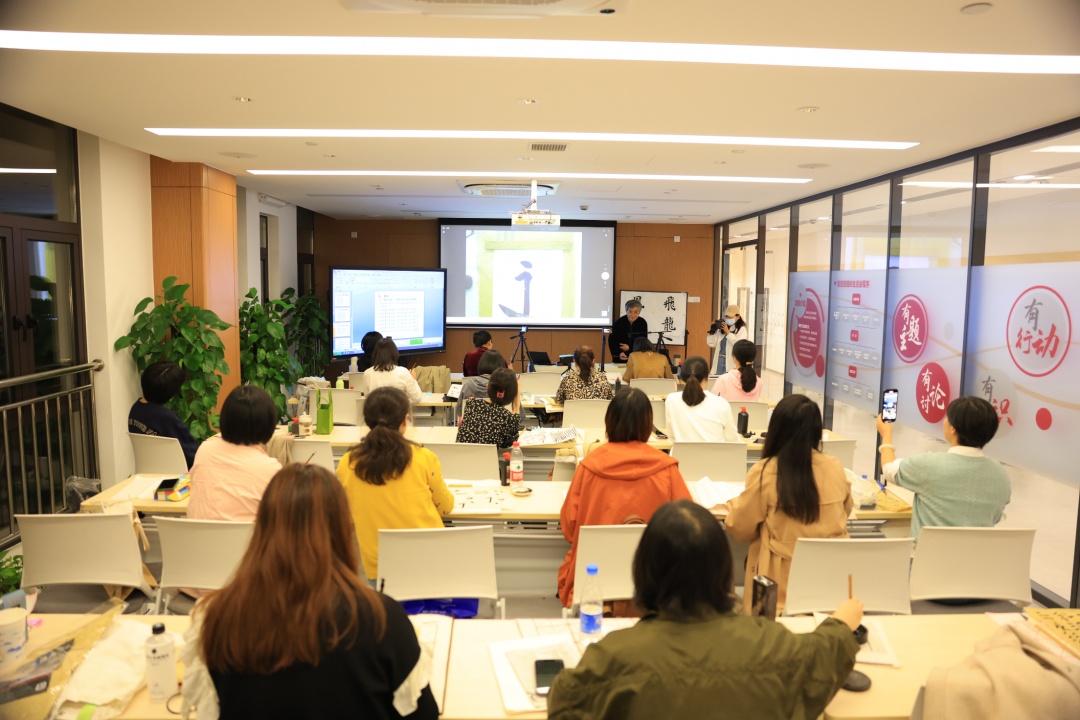 三楼教室里在上的是太极十三势书法。以笔墨纸砚为书写工具,运用太极理论、太极的方式方法,以太极十三势技能书写汉字,是一门武功文练的书法技艺。学员们聚精会神地练习着书法,在提按顿挫中修身养性。