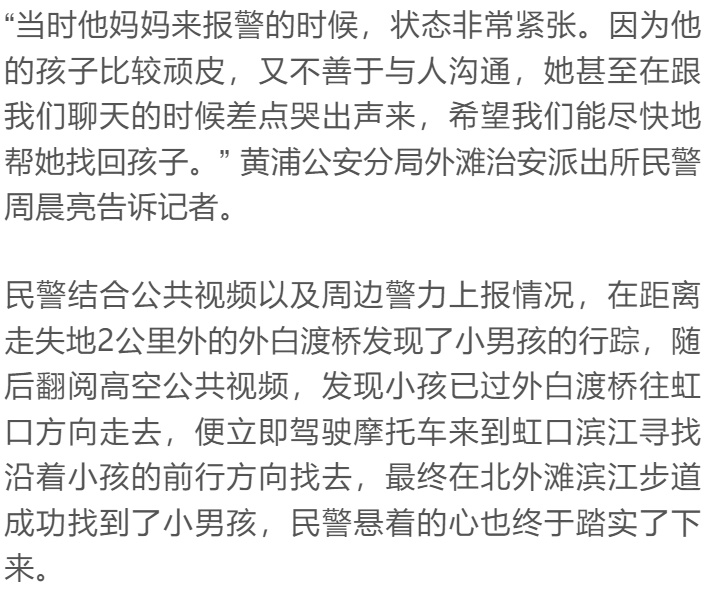 4月30日下午,黄浦公安分局外滩治安派出所就接到一起6岁小孩在外滩走失的求助警情。由于江堤上人流非常多,民警反复查看公共视频,最终发现小男孩已经独自翻过了外白渡桥,走上了虹口滨江。民警立即来到虹口滨江,终于找到小男孩,这时距离小男孩走失已经两个小时。