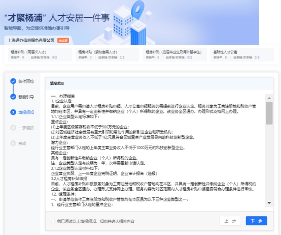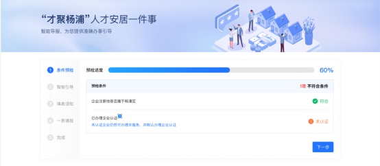 第一步:进入【一网通办杨浦一件事】专题页,进入人才安居服务“一件事”,系统将对用户条件进行预检,自动判断用户是否符合受理条件。