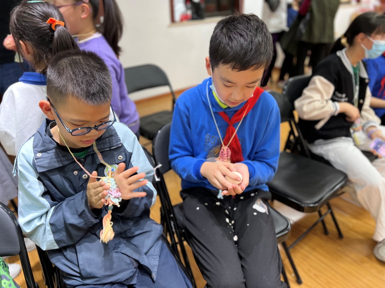 幸福一村温馨钩针班是静安区文化发展专项资金2019年度支持项目。在此次活动中,钩针班的学员们用自己灵巧的双手,钩织出了一个个精美的蛋袋,并装上煮熟的鸡蛋,为学生们挂上。
