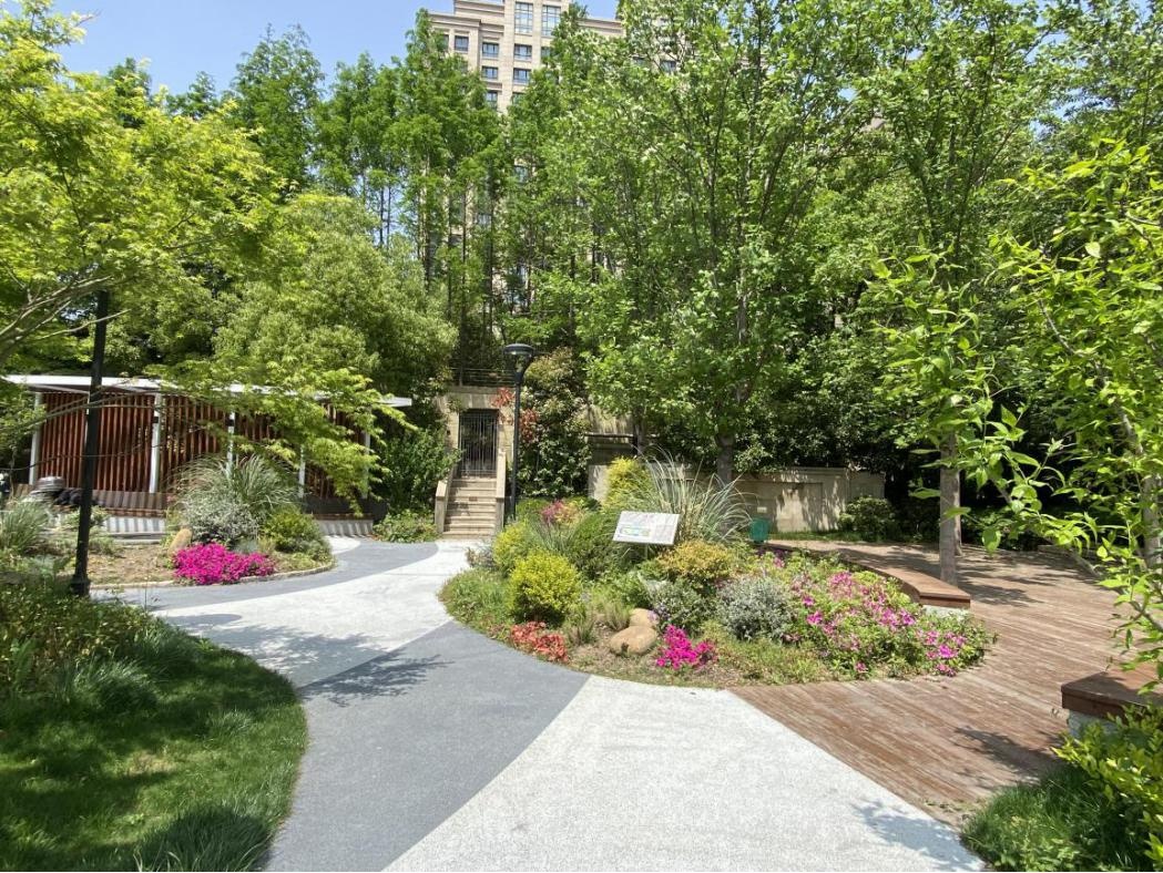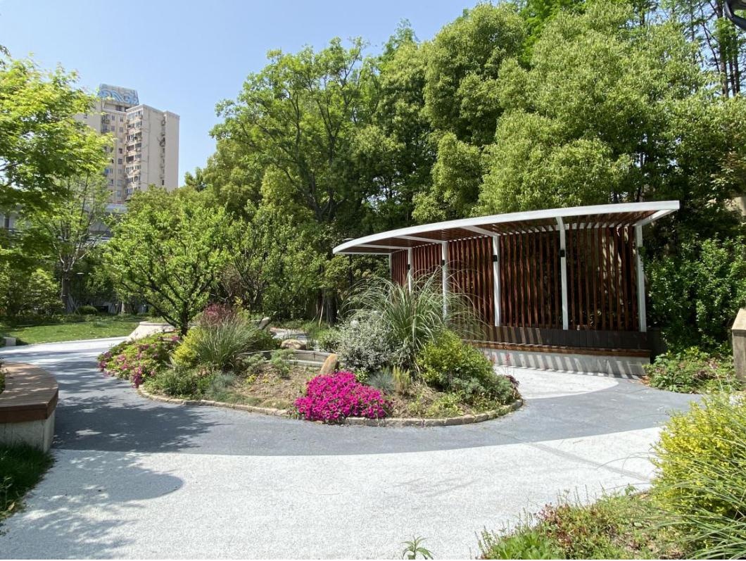 路口东侧是润园口袋公园,面积约1100平方米,改造前绿化郁闭度高,面貌不佳,市民不能进入。普陀区绿化市容局以人民需求为导向,按照口袋公园的设计定位和标准进行绿化改造提升。