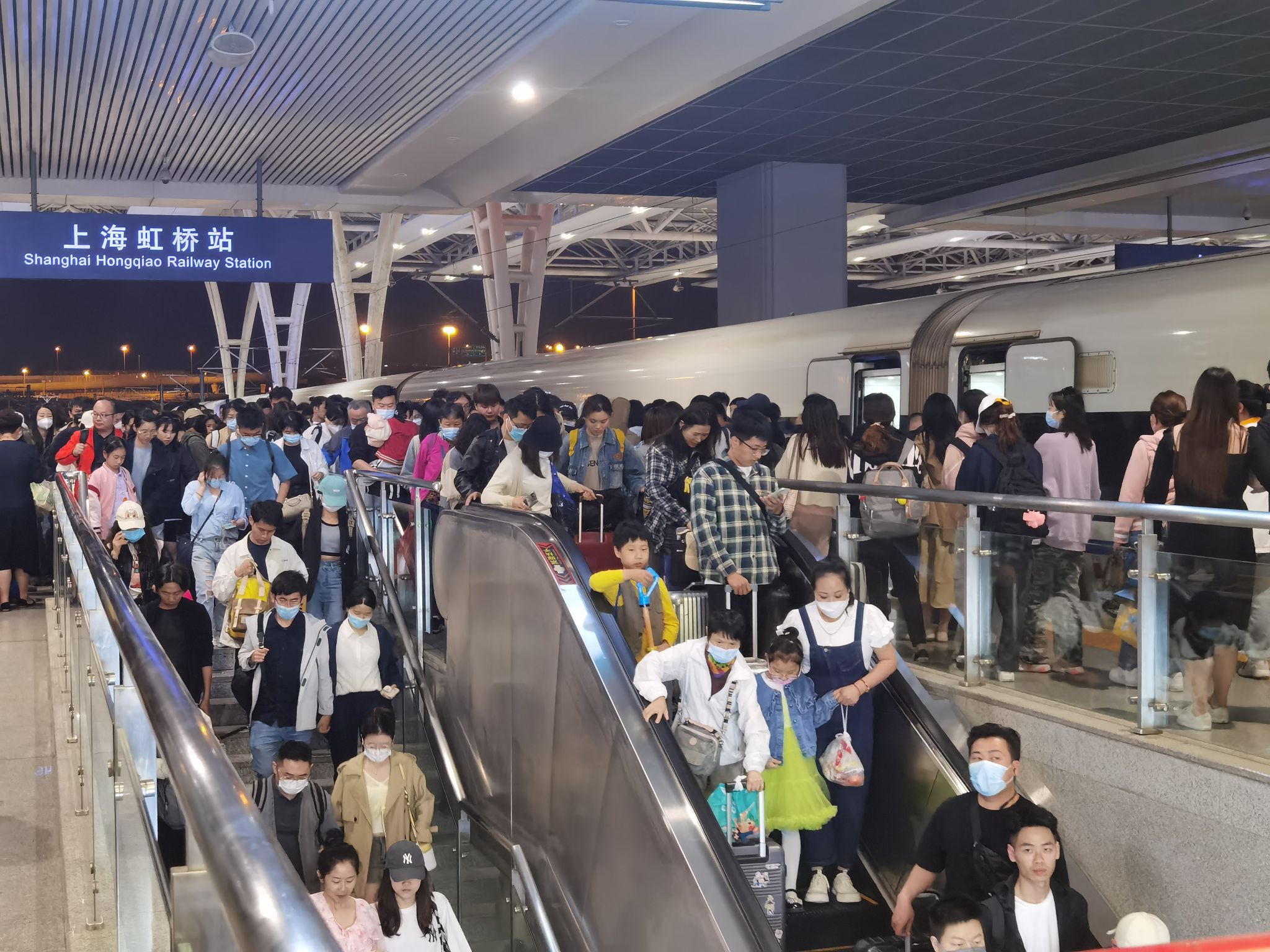 记者从铁路上海站获悉,5月2日,铁路上海站迎来五一返程客流高峰,预计到达旅客58.0万人次,其中上海站17.8万人次,上海南站5.2万人次,上海虹桥站35.0万人次。