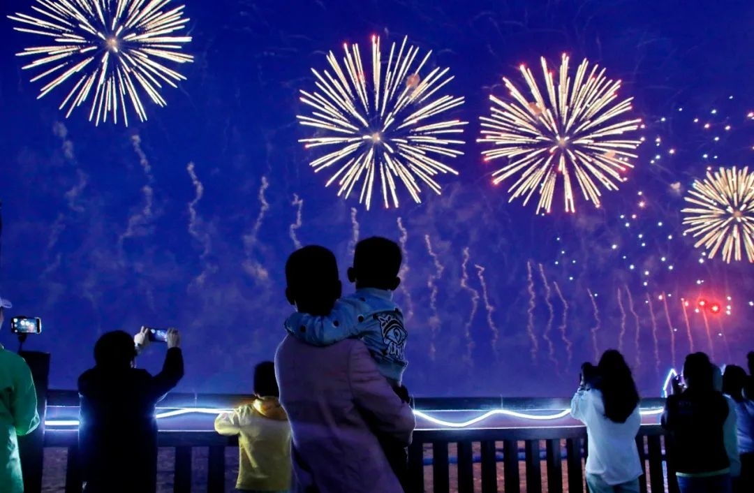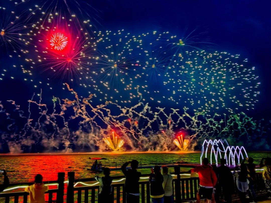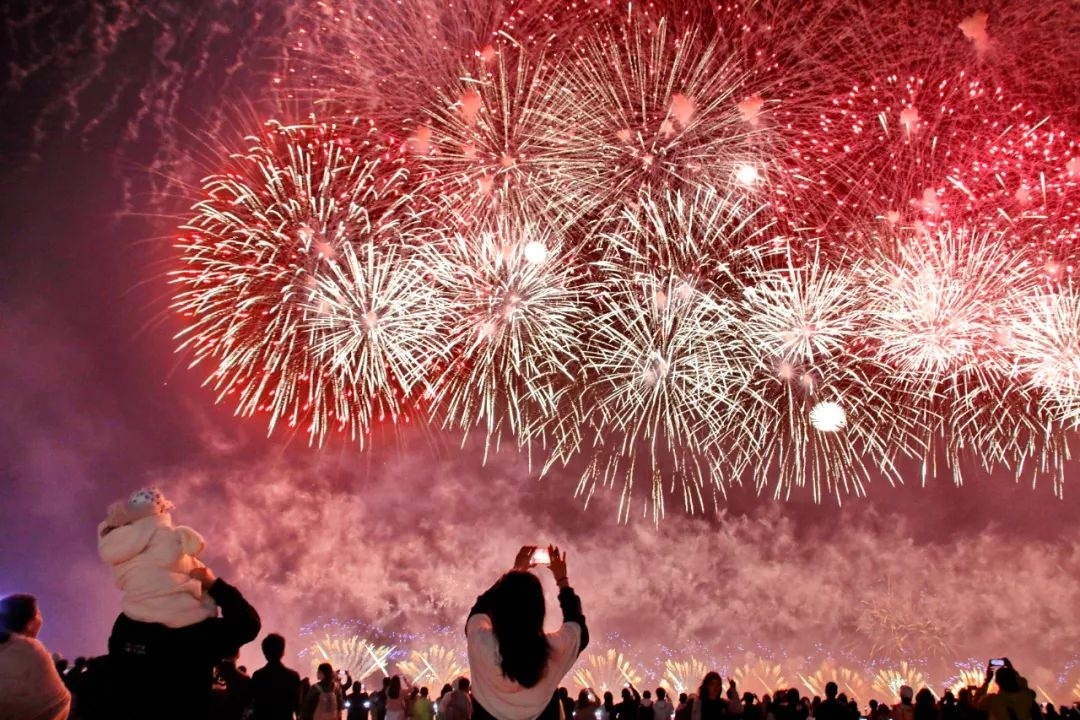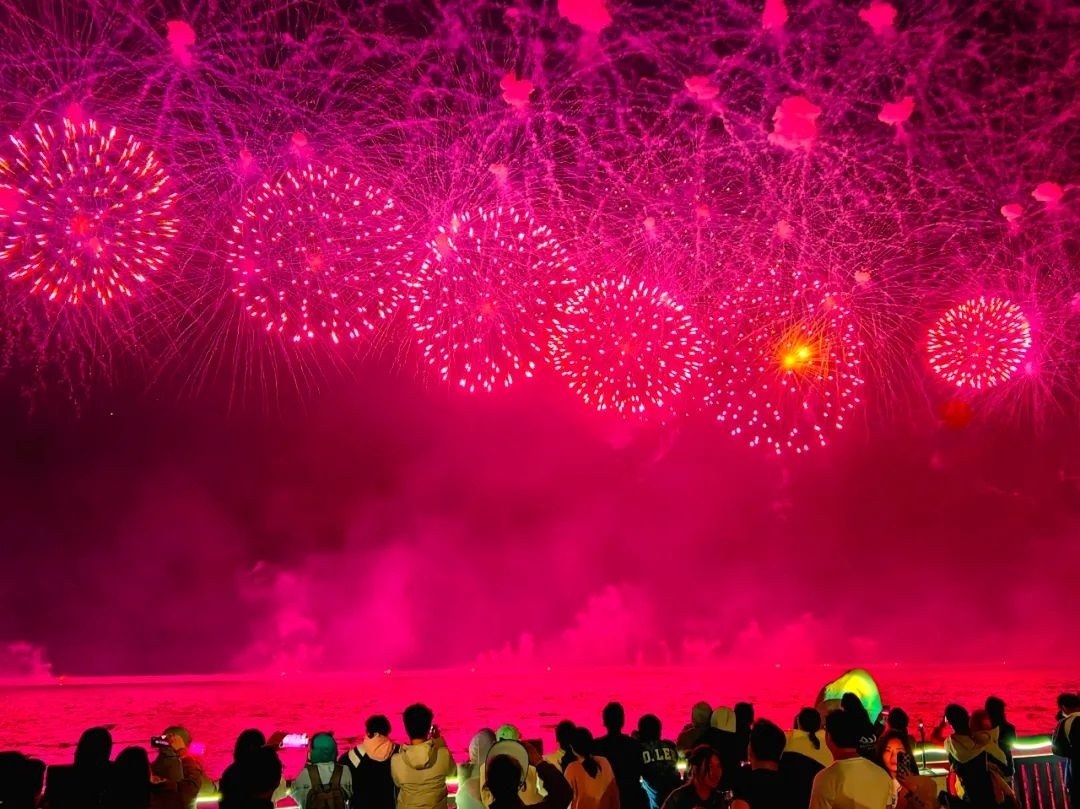 我是第一次看这样的烟花秀,过年的时候自己也放烟花,但今天看到的烟花太炫酷了,让人感觉很震撼。