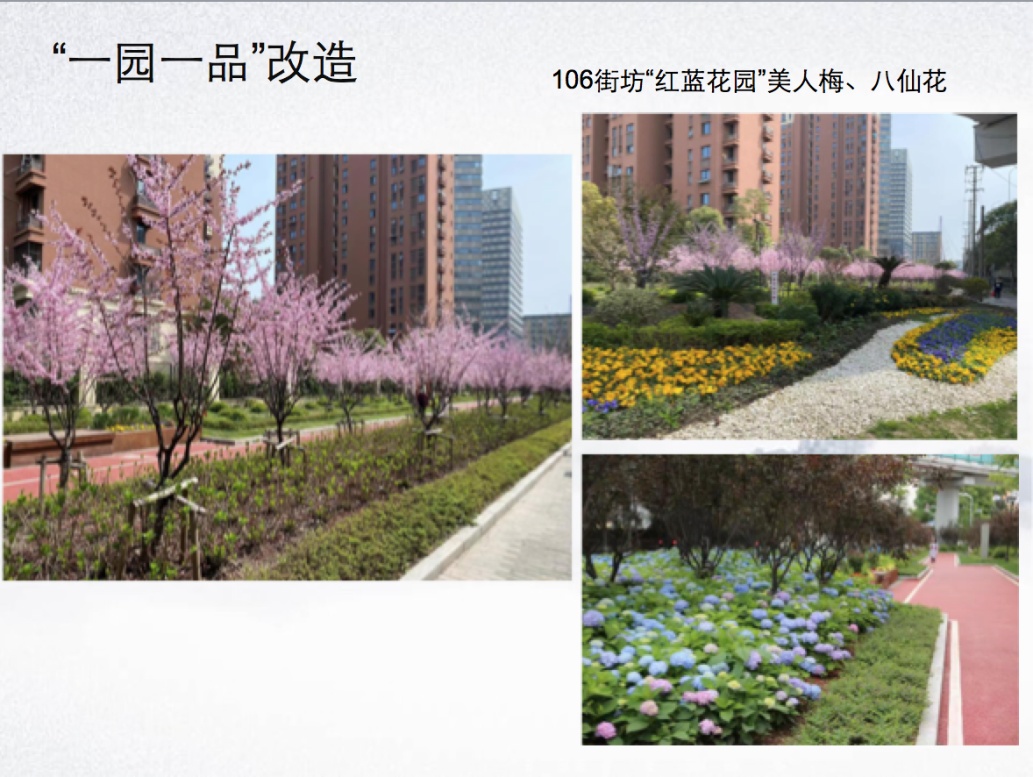 所谓“一路一色、一园一品”,简而言之,就是通过规模化、集群化种植方式,将每种植物的特点和景观效果显著放大,使每个公园绿地、每条道路都拥有主题植物所赋予的鲜明色彩和独特品味。人们可以在不同的季节,去往不同的城市角落,欣赏独属于这个时间、这个地点的自然之美,就如:冬春之交去往松鹤公园、149口袋公园打卡“红梅”;孟春时节或去往政澄路、嫩江路绿道,或去往106口袋公园打卡“美人梅”,亦可去往复兴岛公园、黄兴绿道打卡“染井吉野”樱,去往邯郸路打卡“加拿大紫荆”……;仲春时节,政立路、隆昌路的海棠花带、江湾城路的晚樱花雨、平凉公园的月季花海必将令人驻足流连;盛夏时节,路过中原路营口路看一看多彩的紫薇;深秋时节,走一走四平路的“黄金大道”、赏一赏民星公园的“梦幻枫林”,杨浦的四时景致让市民游客目不暇接。