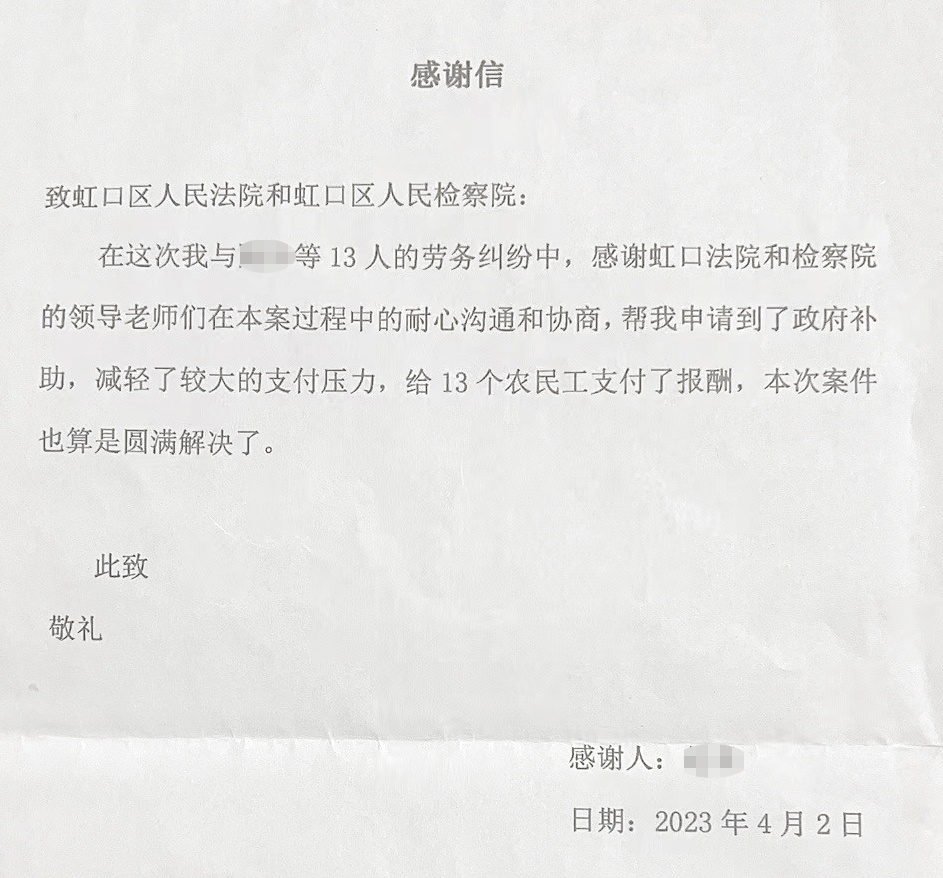 “感谢虹口法院和检察院的领导、老师们在本案过程中的耐心沟通和协商,帮我申请到了政府补助,减轻了较大的支付压力……”4月初,同一批劳动合同纠纷案件的被告赵某同时向检察机关和法院寄来一封感谢信。
