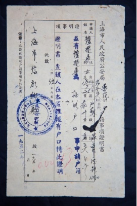 1952年药水弄派出所为信和纱厂工人开具的户籍证明