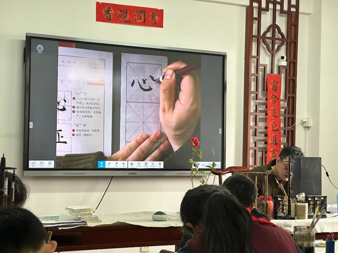 日前,记者来到新桥学校,在一间书法教室内看到,20多名书法社团的学生全神贯注地端坐在书桌前,手中毛笔落在距离眼睛一尺的宣纸上,笔法刚劲有力。在多媒体展示台前,学校专职书法教师刘加顺正在教学生笔画的写法。