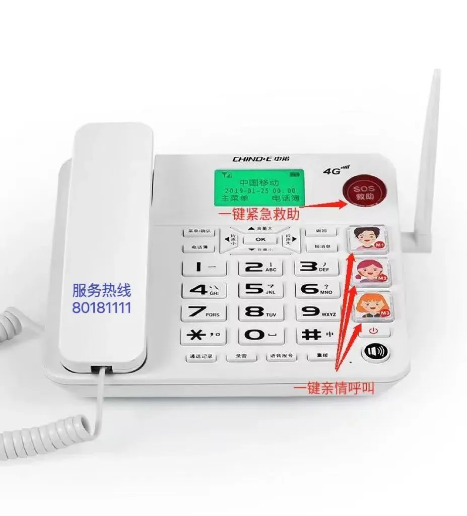 同时,该款话机自带SOS一键紧急求助按键,可随时联系有专人24小时在线守候的呼叫中心,一旦出现突发情况,随时可以帮助呼叫救助。另外,呼叫中心会每月主动打来关爱电话。