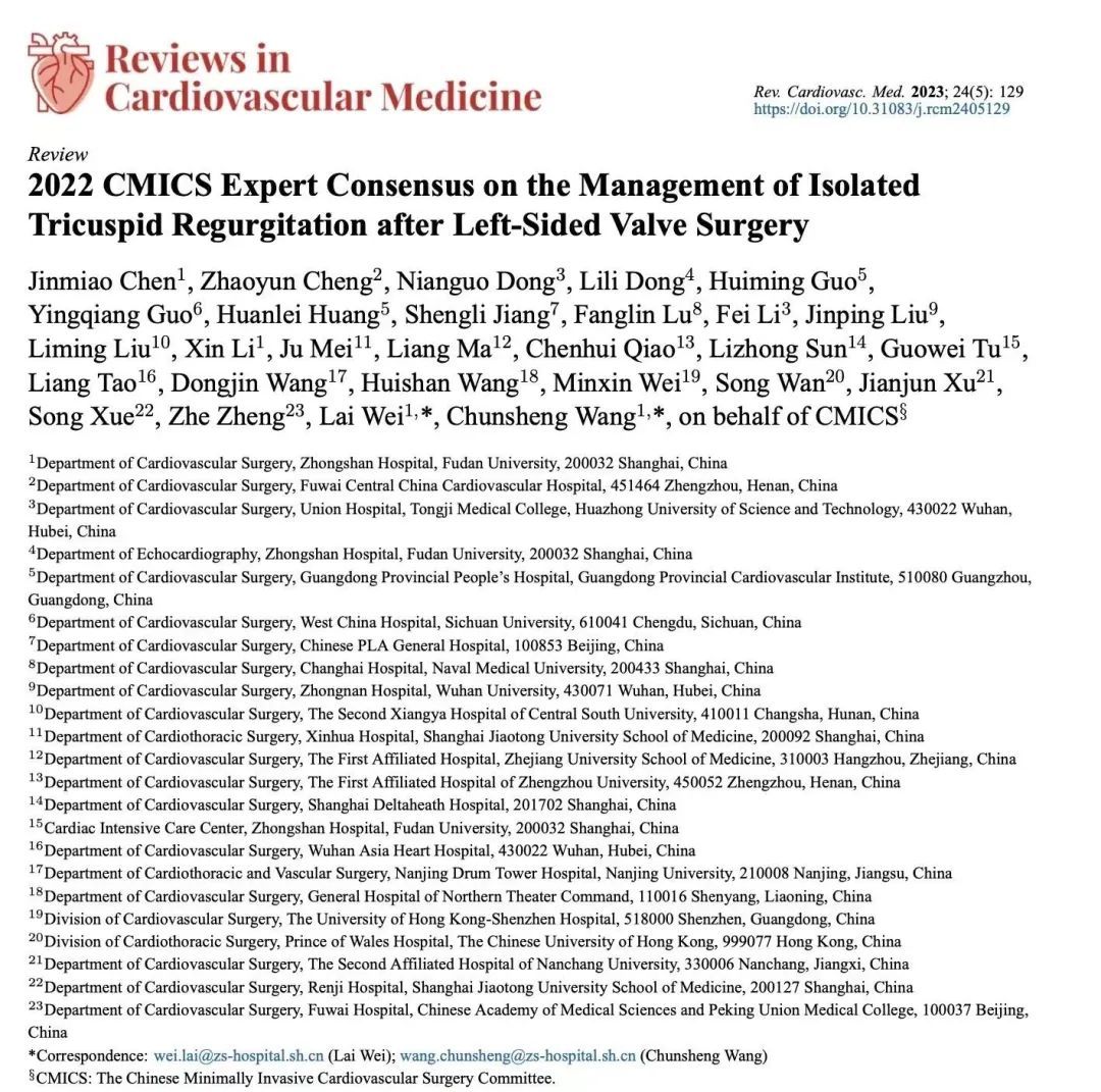针对目前国际学术界缺乏左心瓣膜术后三尖瓣反流诊疗建议这一空白,全面阐述中国专家对该领域的理解和“微创化”创新,推动此类疾病的规范化诊治,以改善患者预后、促进同行协作,在国家心血管病专家委员会微创心血管外科专业委员会(CMICS)主任委员王春生教授和秘书长魏来教授的牵头下,全国20余家中心的相关专家携手,历时一年多筹划、讨论和修稿,撰写了全球首部聚焦于左心瓣膜术后三尖瓣反流诊疗的专家共识。近日以《2022 CMICS Expert Consensus on the Management of Isolated Tricuspid Regurgitation after Left-Sided Valve Surgery》为题目,在线发表于国际心血管学术期刊《Reviews in Cardiovascular Medicine》。