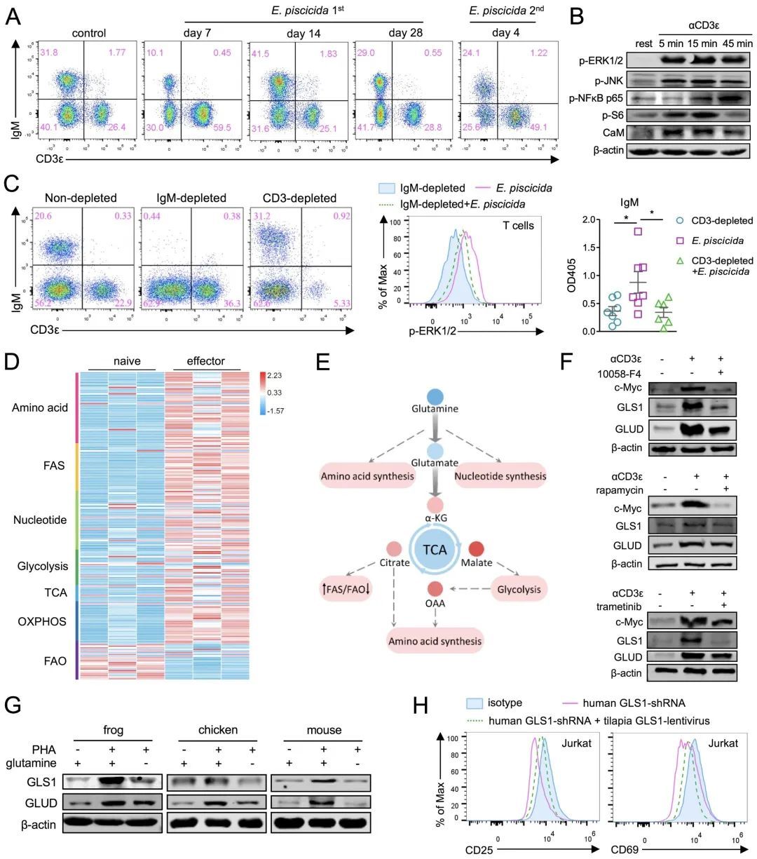 为了解析鱼类T细胞免疫的调控机制,研究团队进行了转录组学分析。结果显示,罗非鱼使用了与哺乳动物相似的转录调控网络支持T细胞免疫;而病原感染罗非鱼后,T细胞的差异表达基因主要富集于代谢通路,且发生了大规模的代谢重编程。由于重编程的代谢程序均直接或间接溯源至谷氨酰胺分解代谢,进而探讨了谷氨酰胺代谢对罗非鱼T细胞免疫的调控。活化的罗非鱼T细胞增加了谷氨酰胺的利用;而谷氨酰胺剥夺或谷氨酰胺酶GLS1的抑制,造成了T细胞增殖和效应功能的障碍。进一步的研究证实,mTORC1和MAPK/ERK通路承接了TCR信号,通过c-Myc调控谷氨酰胺代谢,并促进罗非鱼T细胞免疫。