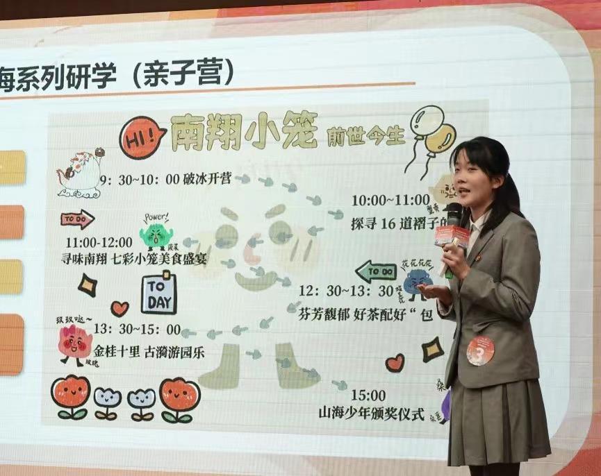 获得2021黄浦区“创业之星”创业计划大赛一等奖的《“山海食客”游学营》就脱胎于“小笼包学院”训练营。该项目以“寻味”南翔小笼包为主线,在趣味游学中走进古猗园,感受“热气腾腾”的海派烟火气,好吃、好玩又好学,是一个完全从00后年轻人视角出发的创业主题。团队成员包括文物修复与保护、营销、艺术设计与制作等不同专业、不同年级的学生,体现了学校社团跨年级、跨专业的“黏合剂”作用。用孩子们的话来说,那就是“只要志同道合,就能成团出道”。