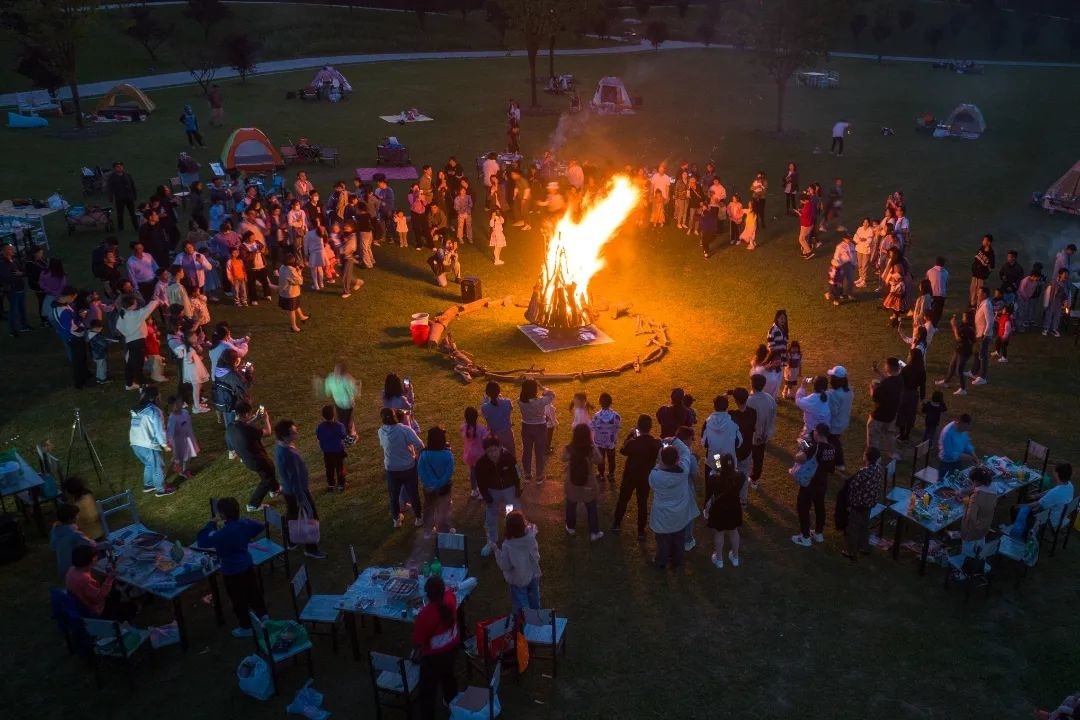 晚上6点半,在工作人员的安排下,前期游戏环节获胜的两位小朋友和家长共同点燃了篝火。现场还组织了游客开展了“击鼓传花”“桃花朵朵开”等互动小游戏,大家围着篝火载歌载舞,欢乐的氛围让游客忘却了烦恼,一起在大自然的怀抱中嬉戏玩耍。
