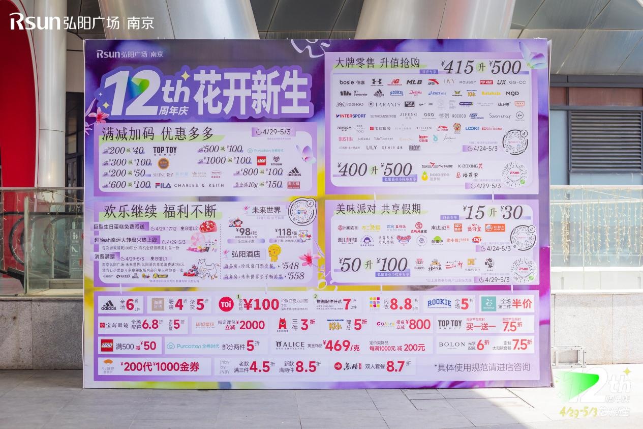 除了精致的场景打造、丰富的内容互动之外,也为全城消费者推出了假期购物狂潮!此次南京弘阳广场12周年庆还放出大额独家福利:大牌零售升值抢购,近60家精品零售415元升500元;美味派对共享假期,多家热门小食15元升30元;更有吃饭皇帝大、蛙小侠、九田家等网红餐饮50元升100元;同时,联动TOPTOY、星聚会、全棉时代、LEGO等众多大牌店铺,开展限量满减活动,掀起五一消费新高潮。