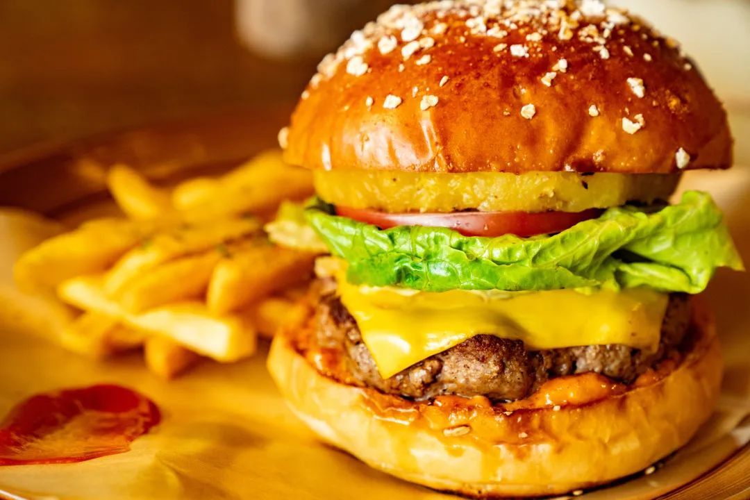 厚厚的一块牛肉扎实不柴,一口咬下去鲜美的汁水在口腔爆开,其中还加了层菠萝,丰富口感。