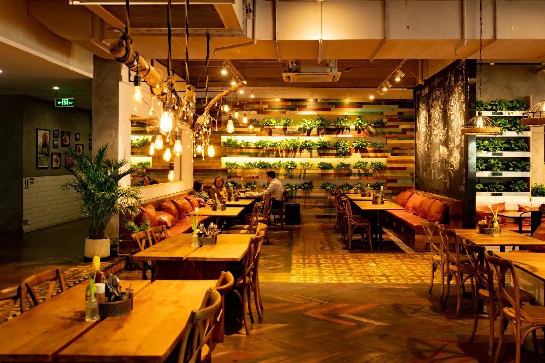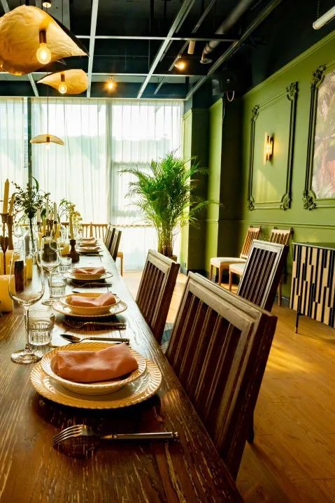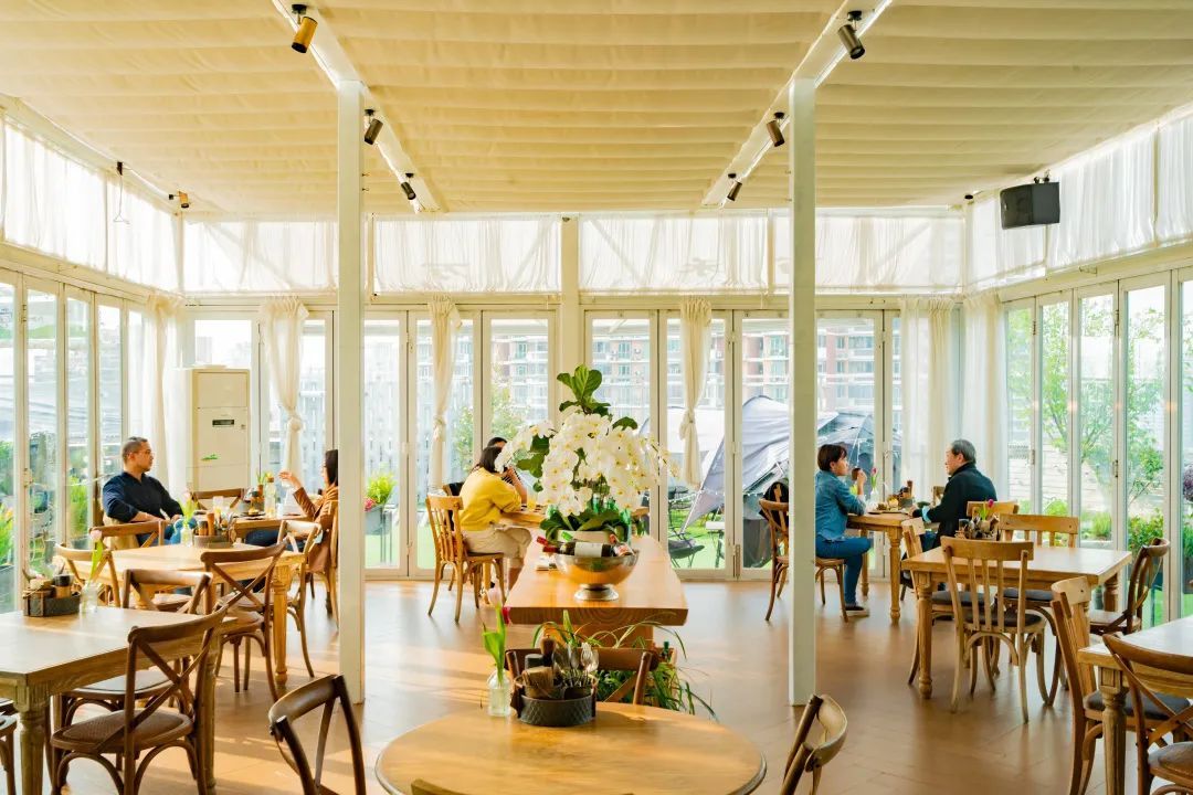 餐厅内,随处可见农场元素。原木色的桌椅简单舒适,木制货架上摆放着新鲜果蔬。从地面、墙面到餐桌间都点缀着各类绿植,让人有拥抱自然的亲切感。