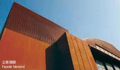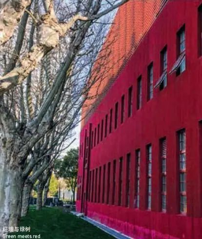 在色彩上,尊重老建筑的风貌,整体采用“深红色”,富有视觉冲击力与历史的沧桑感。玻璃材质的介入使老建筑的“深红色”砖墙与周边景观相融合,不仅使历史气氛得到继承,而且还营造了新的城市形象。