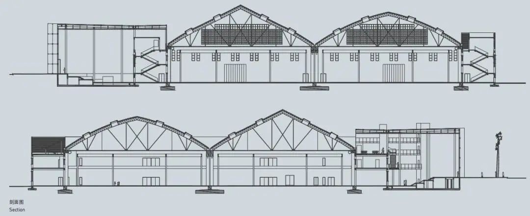原为生产麦道公司MD-82飞机机库,于1950年代由苏联援建。设计对保存完好的机库建筑进行改扩建,保留建筑主体结构,以及坡屋顶、钢结构桁架、钢制大门等精细构件,再现民航历史记忆。同时拓展网架结构的大跨度空间,雕琢局部构造的精细做法,设计继承历史风貌。