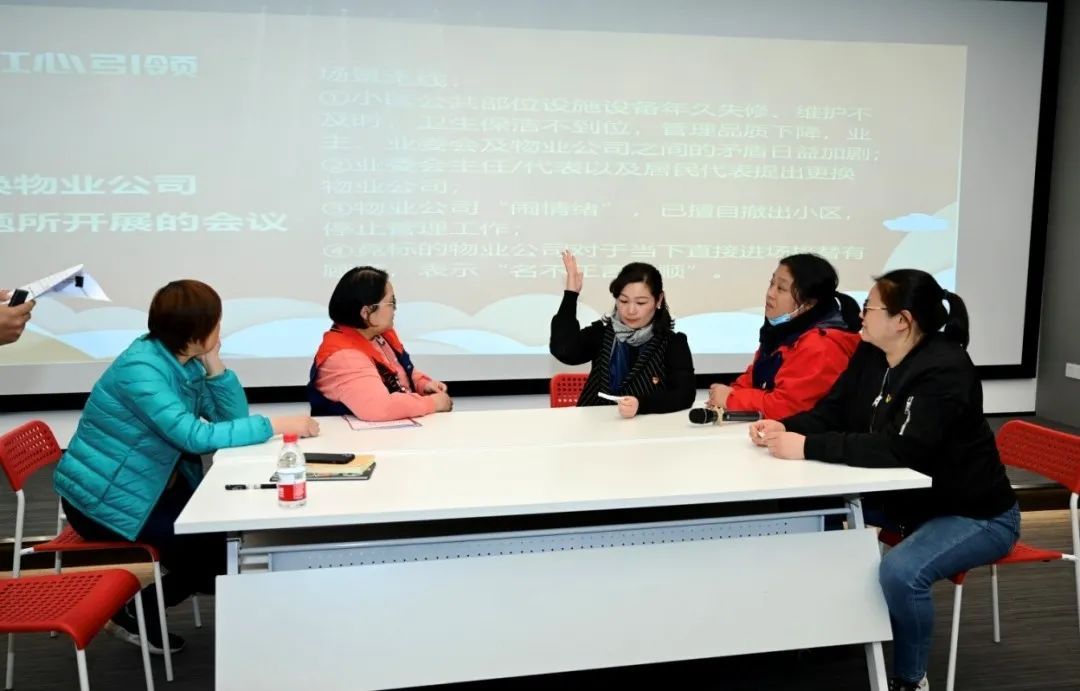 案例与理论的深植于心,是为了更好地开展实践工作。现场就《党建引领三驾马车协同》这一主题,进行了分小组场景演练,并由带教书记和林龙全做点评,为大家梳理了“三驾马车”协同中如业委会换届、更换物业、物业费调涨等具体场景的具体处理方法。